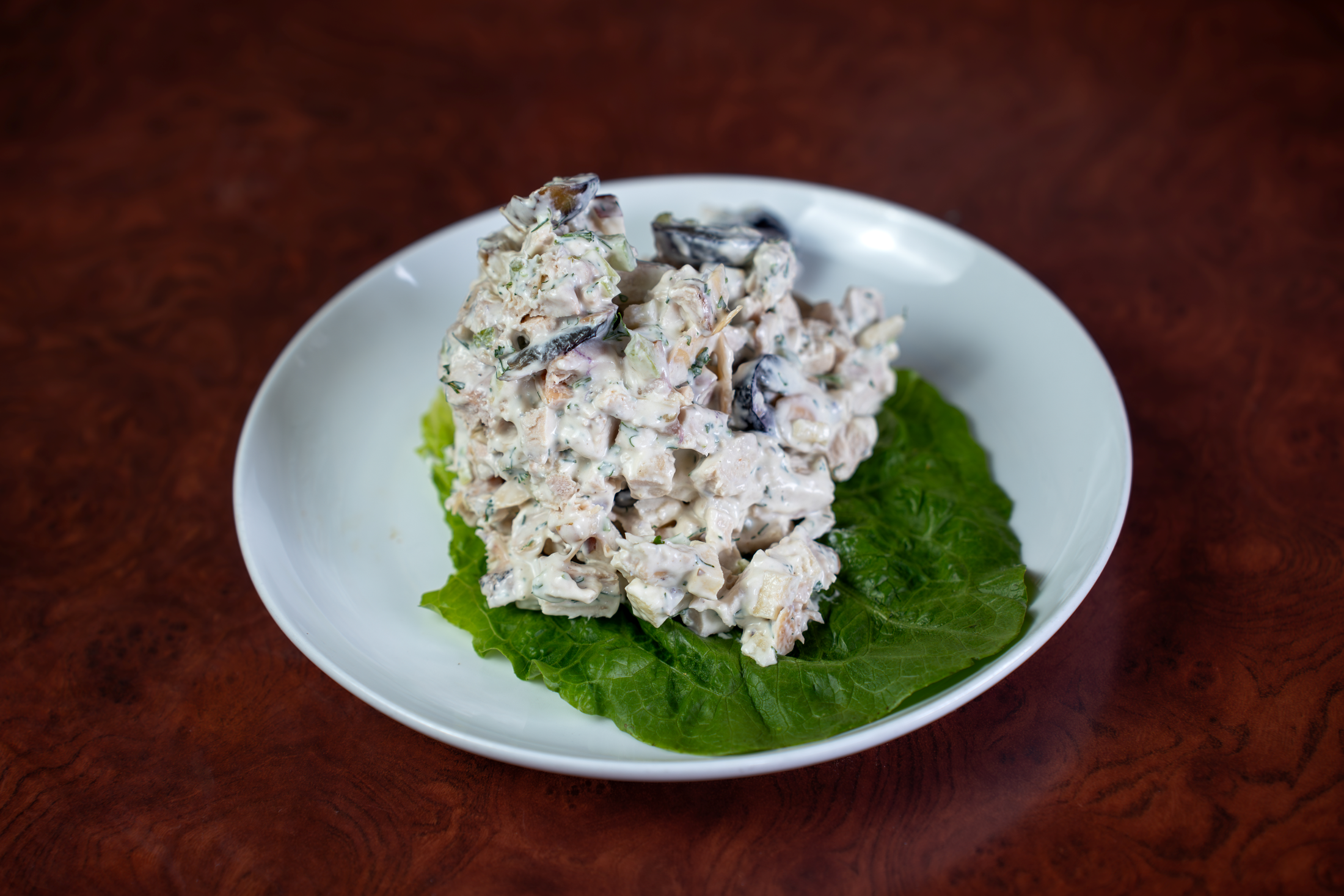 Chicken salad made with grapes, onions, celery, and roasted almonds on a house baked croissant topped with spinach