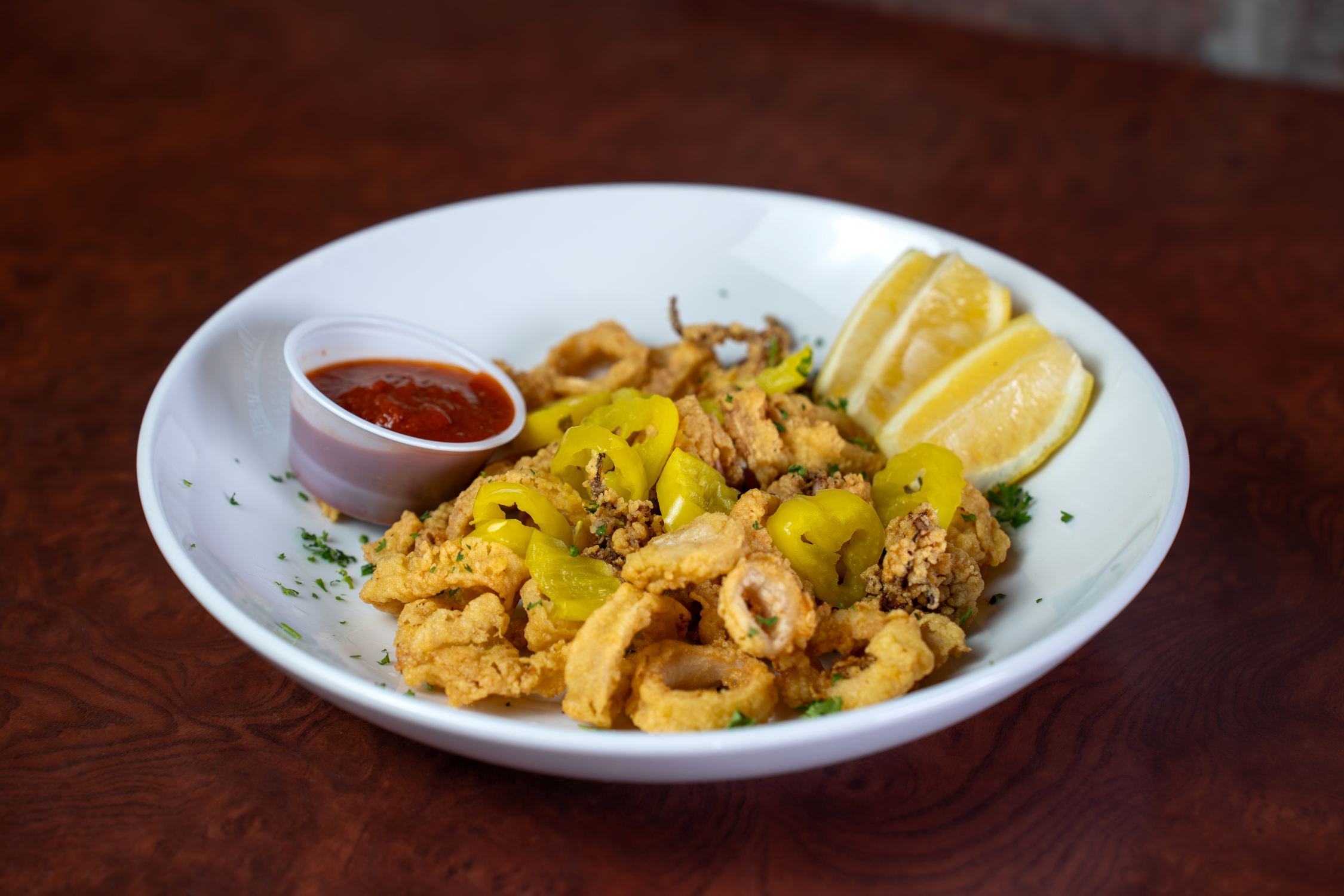 Fried calamari topped with banana peppers and lemons and served with marinara
