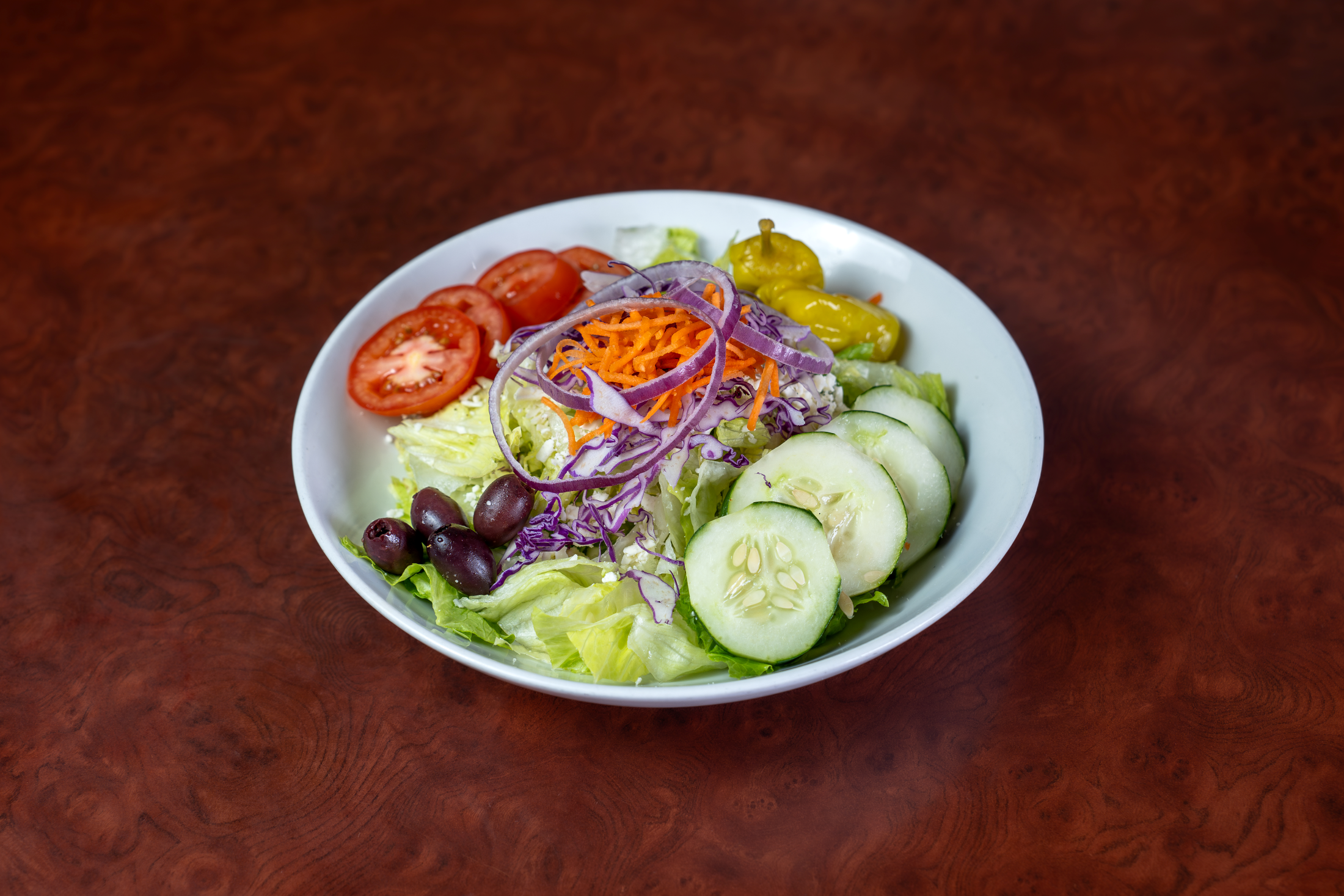 Romaine and iceberg mix, tomatoes, Kalamata olives, carrot, shredded cabbage, cucumbers, feta cheese. pepperoncini, and onions