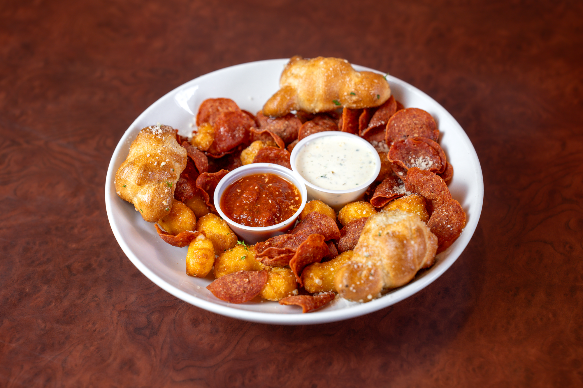 Fried Pepperoni, Cheese Bites, and Baked Garlic Knots served with marinara and jalapeño ranch. Available individually